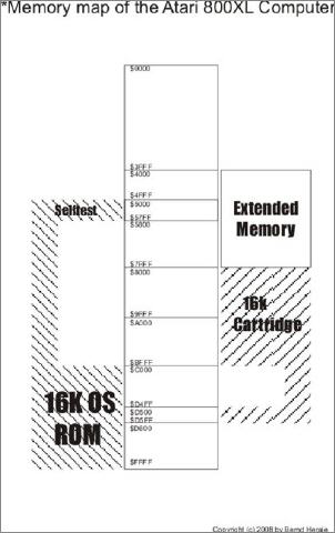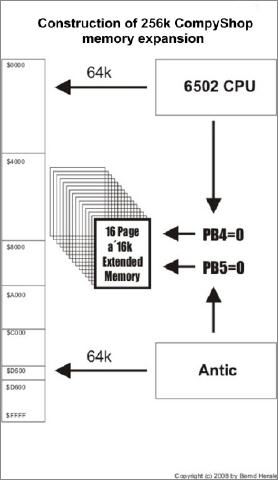 The Atari uses a 6502 CPU with 16 address lines and an 8 data lines. But with 16 address lines there only can be addressed an area of 2^16 (2 to the power of 16) = 65536 = $FFFF bytes which is 64k of memory. To be able to nevertheless access more memory Atari itself has built a computer - the 130XE - which uses a trick to allow 4 additional banks of 16k size to be switched into a specific memory range (bank switching). As a special feature the CPU and the ANTIC can access the extended memory independet of each other. This kind of memory access was used by the German company „CompyShop“ for their memory extension, since that their name is used for such extensions since then. At the second port of the 6520 PIA component (PB) the PB2 and the PB3 Bit are used for bank switching, PB4 for 6502 CPU access and PB5 for ANTIC access. Port PB is located at address $D301 - 54017.